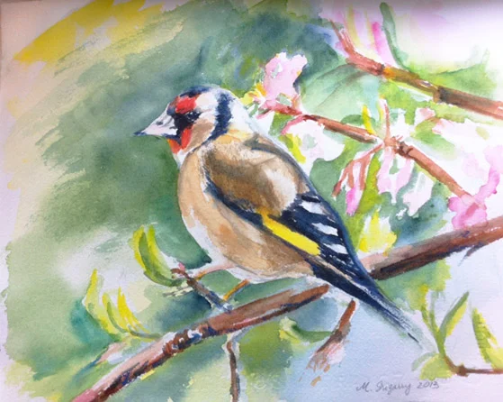Motivated by the May 2013 challenge in the watercolor group of the site "Paint my Photo", I've been painting some small watercolors of birds. The challenge was to paint a male goldfinch in a loose way...and I tried, but I'm just a tight painter...actually, I try to be at a point mid-way between loose and tight and I like both extremes: loose almost abstract paintings and photo-realistic paintings.